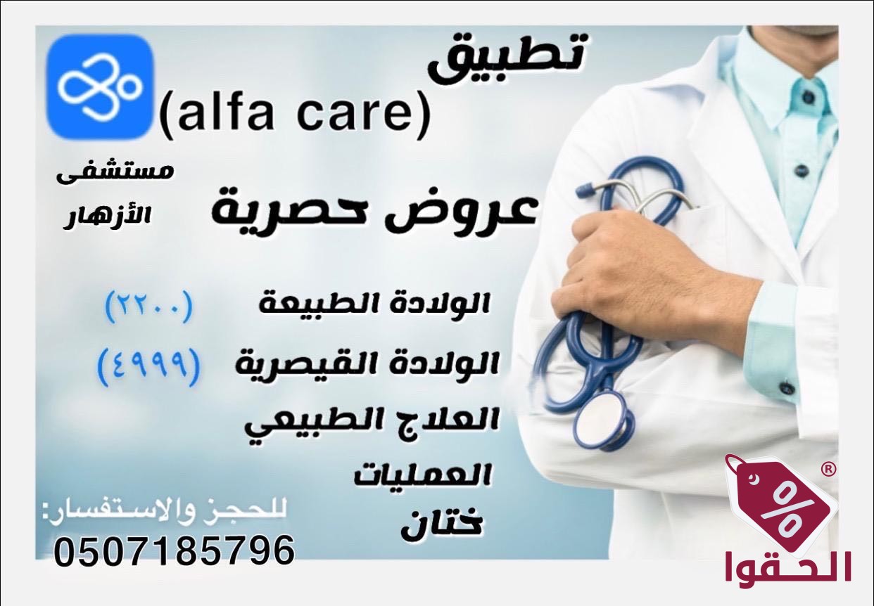 عروض مشفى الازهار مع تطبيق (alfa care ) خصم قوي بأستخدام كود HS10 الولادة الطبيعيه 2200 الولادة القيصريه 4999 ( السعر شامل الضريبة وفتح الملف والكشف وتحاليل واشعة الام قبل الولادة تحاليل الطفل بعد الولادة تطعيم الطفل ) يوجد خصم عل التطبيق الولادات ختان عمليات أستئصال الناسور او الخراج البواسير المرارة اللوز الحميه الجيوب الأنفيه الفتاق بجميع حالاتك أستئصال الرحم العلاج الطبيعي أستئصال الغضاريف الأنفيه رفع المثانة والمستقيم للأستفسار يرجى التواصل عل الرقم 0507185796