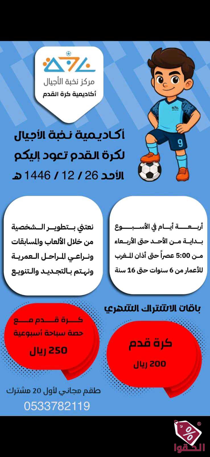 مركز نخبة الأجيال أكاديمية كرة القدم يقدم لكم باقات الاشتراك الشهري كرة قدم 200 كرة قدم مع حصة سباحة أسبوعية 250 أربعة أيام في الأسبوع للإستفسار ج 0533782119